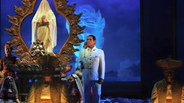 Here are photos from the previous spectacularly beautiful Opera Australia production by Ann-Margret Petterson, showing various casts from several different revivals including the spectacular Emma Matthews and the fabulous Nicole Car as Leila, the virginal priestess, the sensational Michael Lewis as Zurga, the village headman, friend of Nadir and in love with Leila, and the gorgeous Henry Choo as Nadir, one of the pearl divers also in love with Leila.